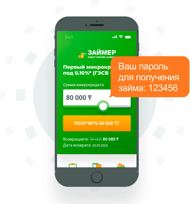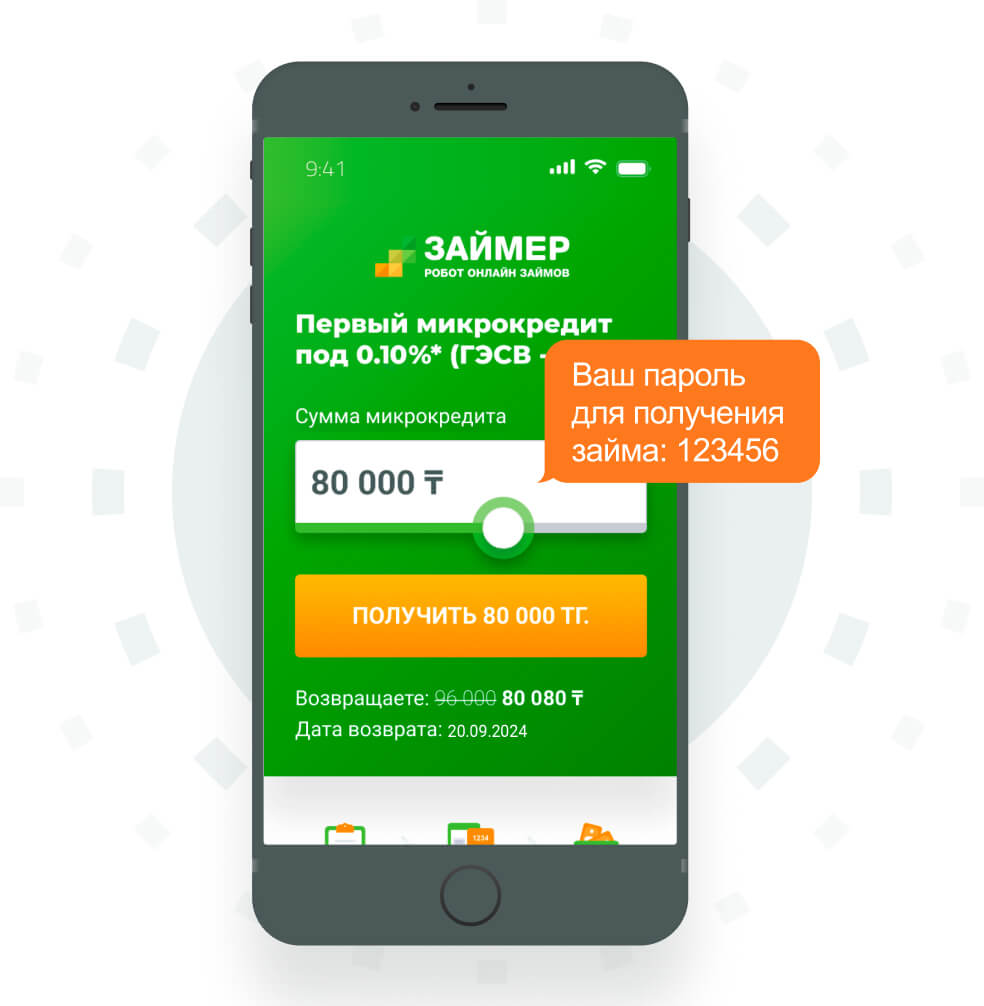 Чтобы стать нашим клиентом Вам необходимо зайти на сайт https://satcredit.kz и пройти 5 шаговую регистрацию. Для этого Вам необходимо в калькуляторе с помощью бегунка выбрать желаемую сумму и нажать на кнопку Получить. Сумма микрокредита может быть от 10 000 тг до 300 000 тг, срок до 12 месяцев. Максимальная сумма одобрения рассчитывается индивидуально для каждого клиента, исходя из личных данных и данных Вашей кредитной истории.